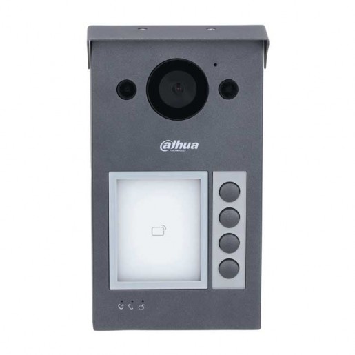 Вызывная панель с разрешением камеры 2мп и CMOS сенсором, угол обзора по горизонтали 125°, алюминевый сплав, уровень защиты IP65, IK08. Поддержка режима "Ночь" и голосового оповещения. Групповые вызовы. С четырьмя кнопками. Видео и аудио сообщения. Удаленный доступ через мобильное приложение DMSS. Установка на стену. Питание: DC 48V, PoE(802.3af), 2-проводной контроллер
